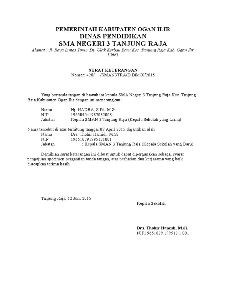 Contoh Surat Spesimen Pergantian Bendahara Bos Tingkat Pendidikan Pendidikan Dasar Kepala Sekolah