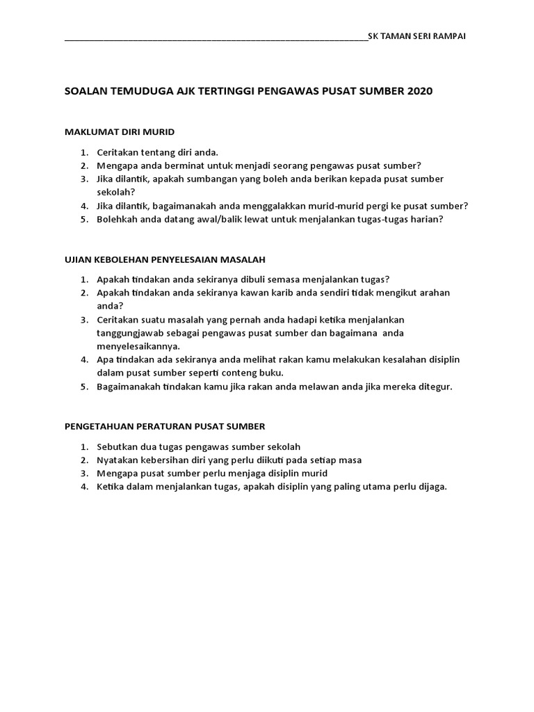Soalan Temuduga Ajk Tertinggi Pengawas Pusat Sumber 2020 Pdf