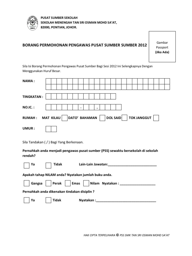 Borang Permohonan Pengawas Pusat Sumber Bagi Sesi 2012 Pdf